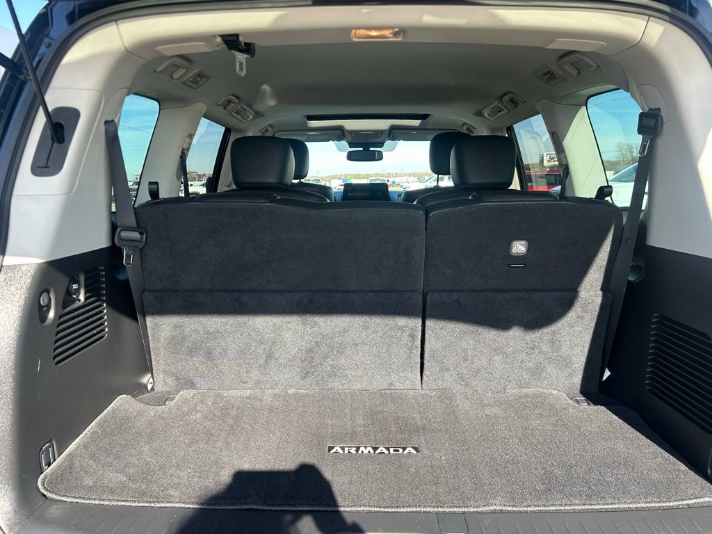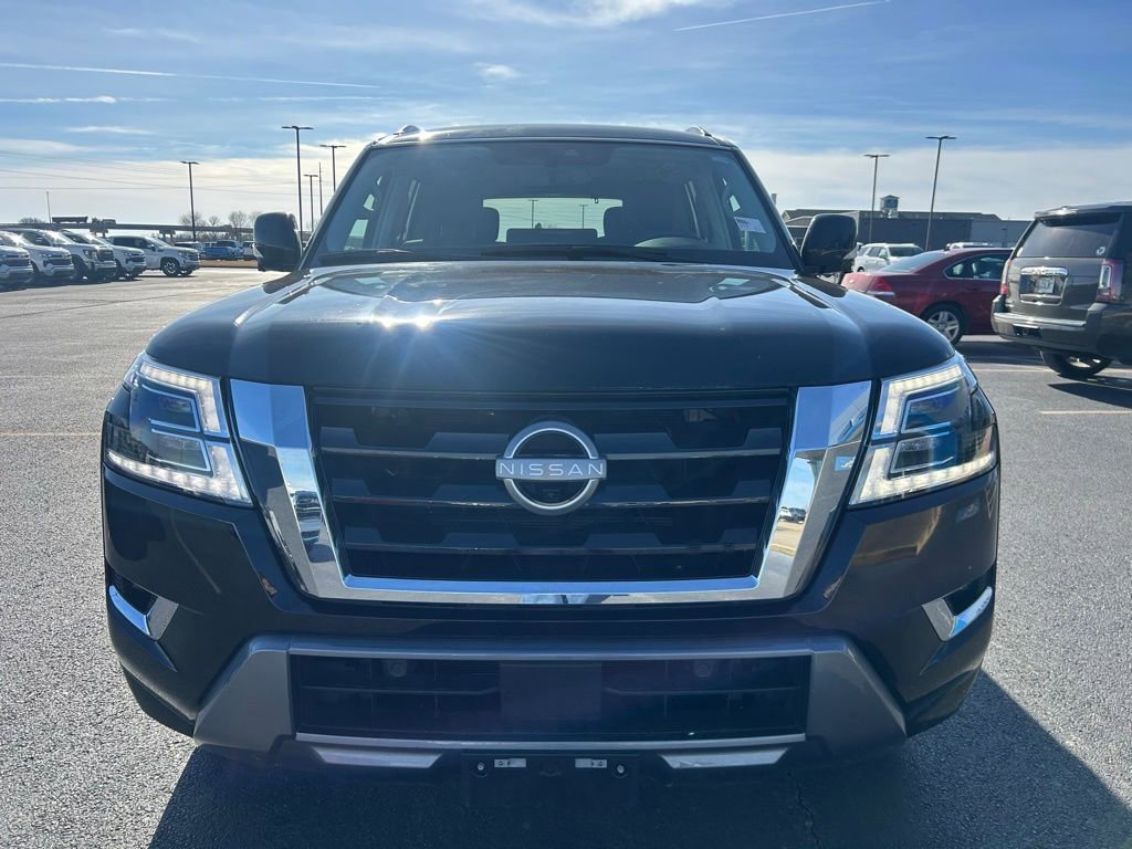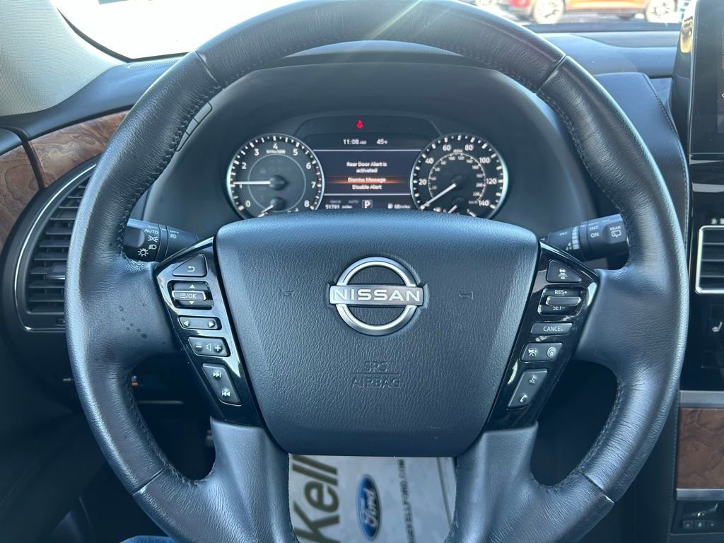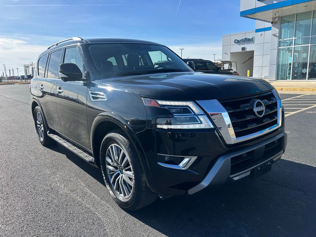 Odometer is 8916 miles below market average! George Kell Motors is proud to present you with another True Market Priced Pre-Owned Vehicle. This 2023 Nissan Armada SL is loaded with the following Factory Options:Captain's Chairs Package (2nd Row Captain's Chairs and 2nd Row Center Console w/Padded Armrest), 4WD, 13 Speakers, 2.94 Axle Ratio, 3rd Row Carpeted Floor Mats - Captain Seat, 3rd row seats: split-bench, 4-Wheel Disc Brakes, ABS brakes, Air Conditioning, Alloy wheels, AM/FM radio: SiriusXM, Anti-whiplash front head restraints, Auto High-beam Headlights, Auto tilt-away steering wheel, Auto-dimming door mirrors, Auto-dimming Rear-View mirror, Auto-leveling suspension, Automatic temperature control, Bose 13-Speaker Premium Audio System, Brake assist, Bumpers: body-color, Delay-off headlights, Driver door bin, Driver vanity mirror, Dual front impact airbags, Dual front side impact airbags, Electronic Stability Control, Emergency communication system: NissanConnect Services, Exterior Parking Camera Rear, Four wheel independent suspension, Front anti-roll bar, Front Bucket Seats, Front Center Armrest, Front dual zone A/C, Front fog lights, Front reading lights, Fully automatic headlights, Garage door transmitter: HomeLink, Heated door mirrors, Heated Front Bucket Seats, Heated front seats, Heated steering wheel, Illuminated entry, Knee airbag, Leather Shift Knob, Leather-Appointed Seat Trim, Low tire pressure warning, Memory seat, Navigation System, NissanConnect featuring Apple CarPlay and Android Auto, Occupant sensing airbag, Outside temperature display, Overhead airbag, Overhead console, Panic alarm, Passenger door bin, Passenger vanity mirror, Power door mirrors, Power driver seat, Power Liftgate, Power moonroof, Power passenger seat, Power steering, Power windows, Premium audio system: Bose, Radio: NissanConnect w/SiriusXM, Rear air conditioning, Rear anti-roll bar, Rear reading lights, Rear seat center armrest, Rear window defroster, Rear window wiper, Reclining 3rd row seat, Remote keyless entry, Security system, Speed control, Speed-sensing steering, Speed-Sensitive Wipers, Split folding rear seat, Spoiler, Steering wheel memory, Steering wheel mounted audio controls, Tachometer, Telescoping steering wheel, Tilt steering wheel, Traction control, Trip computer, Turn signal indicator mirrors, Variably intermittent wipers, Voltmeter, and Wheels: 20 x 8J Painted Alloy.